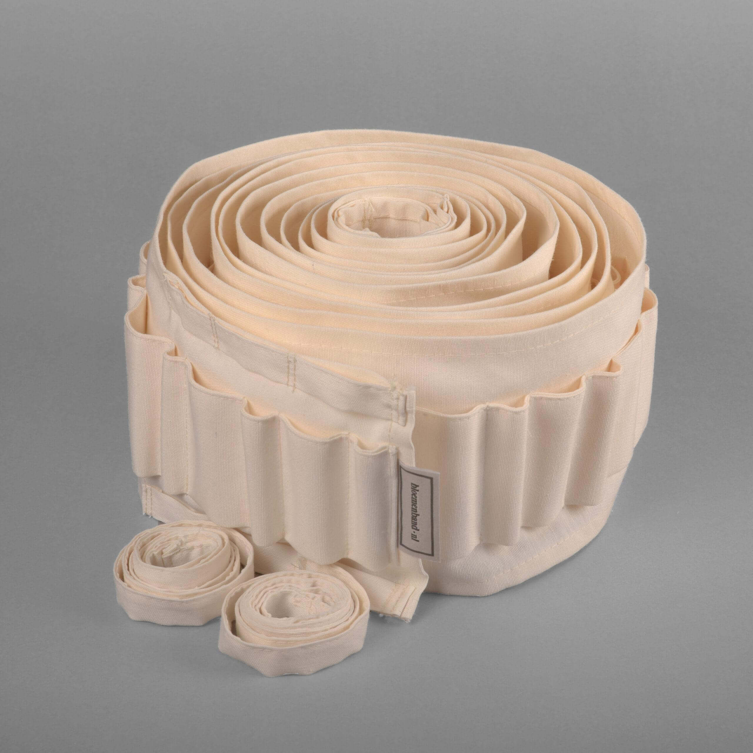 De Bloemenband van ongebleekt katoen is een handgemaakte, natuurlijke bloemenband voor rondom de uitvaartkist. De band is voorzien van lusjes waarin nabestaanden eenvoudig bloemen kunnen steken, waardoor een warm en persoonlijk eerbetoon ontstaat. Gemaakt van stevig, 100% ongebleekt katoen en verkrijgbaar in drie maten, past deze band bij vrijwel iedere kist. Een stijlvolle, duurzame en troostrijke toevoeging aan ieder afscheid.