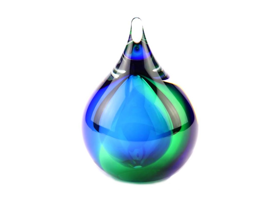 De Asdruppel – Memorie Line Bubble | 120 ml | Blauw Groen is een ronde druppelvorm met een geoliede kleurschakering. Dit houdt in dat deze glazen urn gemaakt is in de vorm van een druppel. Daarnaast lopen de geoliede kleuren vloeiend in elkaar over. Dit geeft een mooie en warme uitstraling aan de asdruppel.